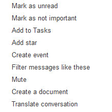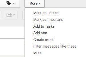 Gmail More Posted on September 18, 2012 by ehrok Gmail에서 이메일을 읽을때 상단 우측(라벨옆) 끝에 More 버튼이 있습니다. 다양한 기능이 좀 더 있지요. 음? 이상하군요. 저는 Create a Document가 보이는데 어떤 계정에서는 안보이는군요. 차이는 잘모르겠네요. Labs 선택차이 일수도 있겠습니다.