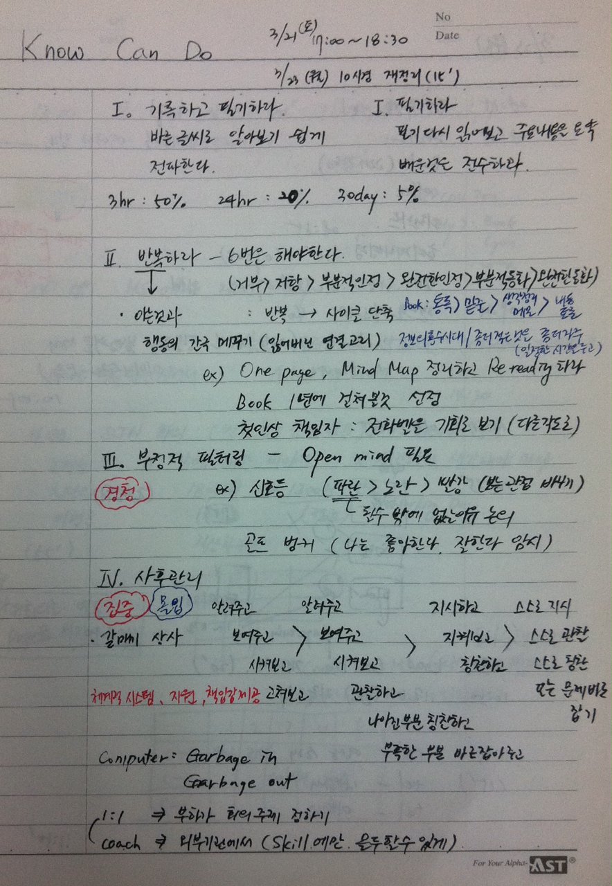 - 필기한 것을 다시 읽어보고 주요 내용을 요약하라. 반드시 단정한 글씨로 메모하라!(필사/누적 반복/서머리)