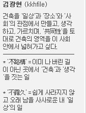 kkhfile Posted on February 4, 2013 by ehrok 不路構, 不露久, Blog 출처: 서울대학교 건축학과 김광현교수 不路構/不露久 :: 네이버 블로그. 😐 솔직 담백한 블로그를 운영하는 교수님이 더 많아졌으면 좋겠습니다. 많이 배우게 됩니다.