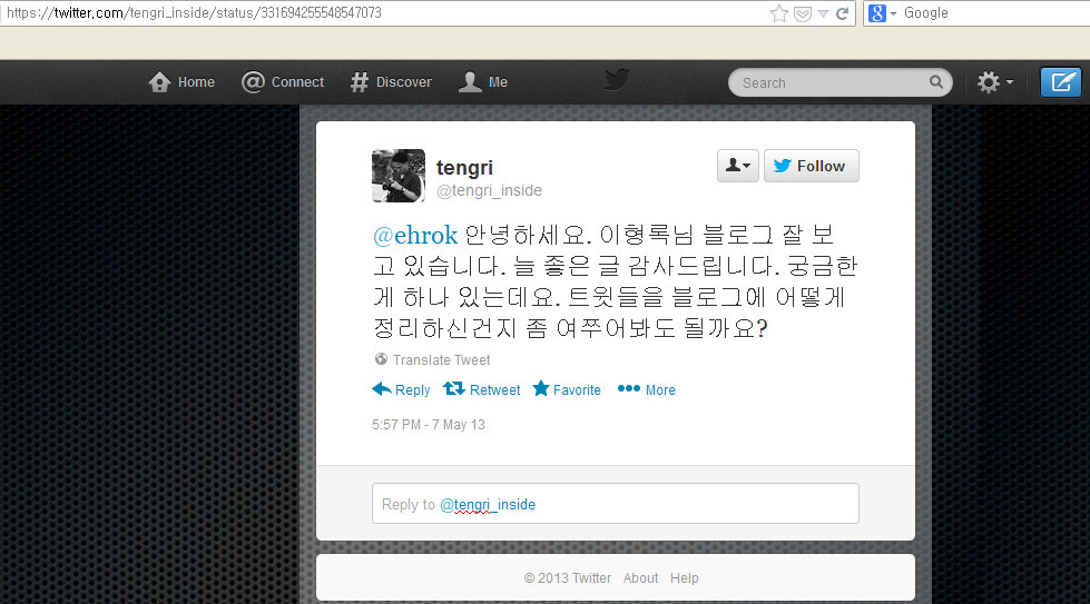 - 그 주소(https://twitter.com/tengri_inside/status/331694255548547073)를 그대로 글에 붙여넣으면 저절로 embed된다.