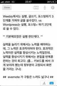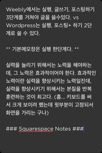 에버노트와 구글드라이브에서 문서 작성시 타이핑보다 느린 버퍼가 자주발생하여 둘다 탈락. Squarespace Notes나 기본 메모장이 최종 우승.