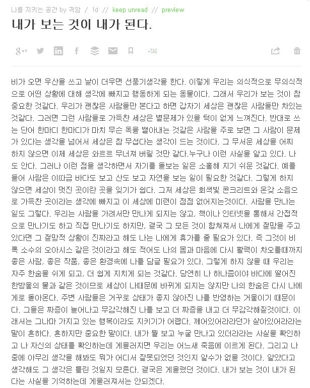 😐 격암선생님의 블로그 http://blog.daum.net/irepublic 도 추천하려보니 피드로 구독하면 단락 구분이 전혀 안되기 때문에 보류. 이 추천 글과도 일맥 통하는 것이 있는 내용.