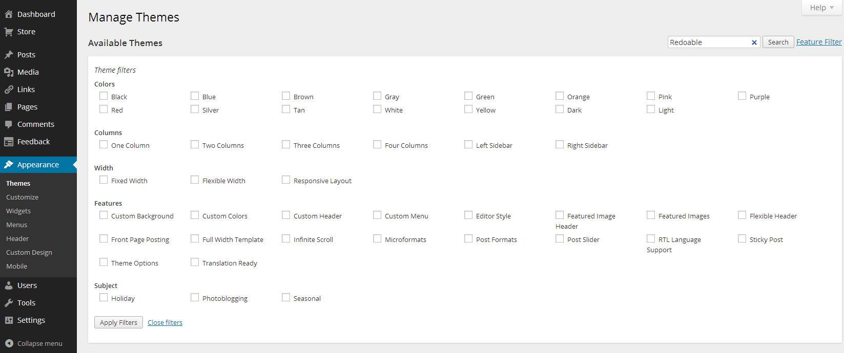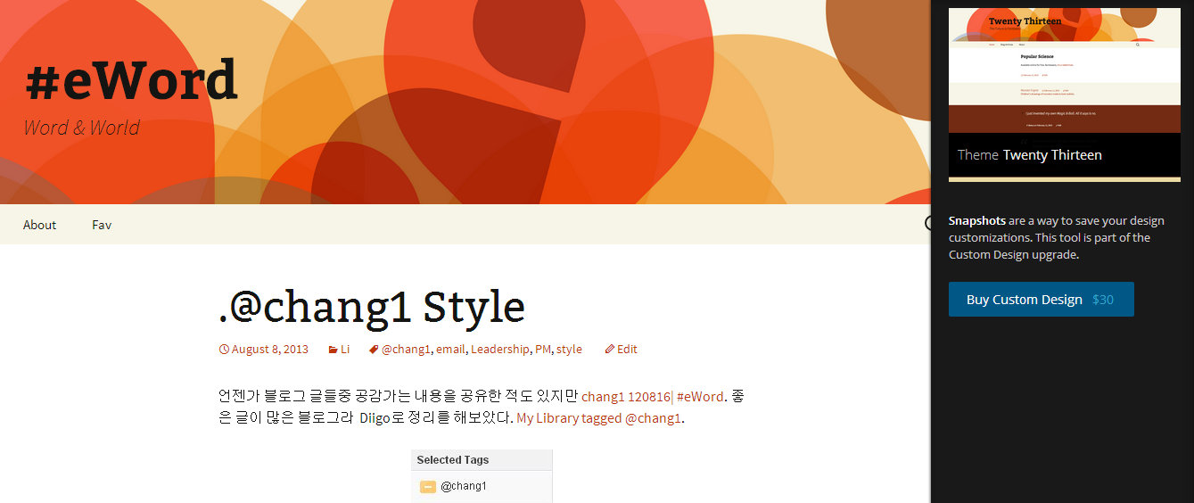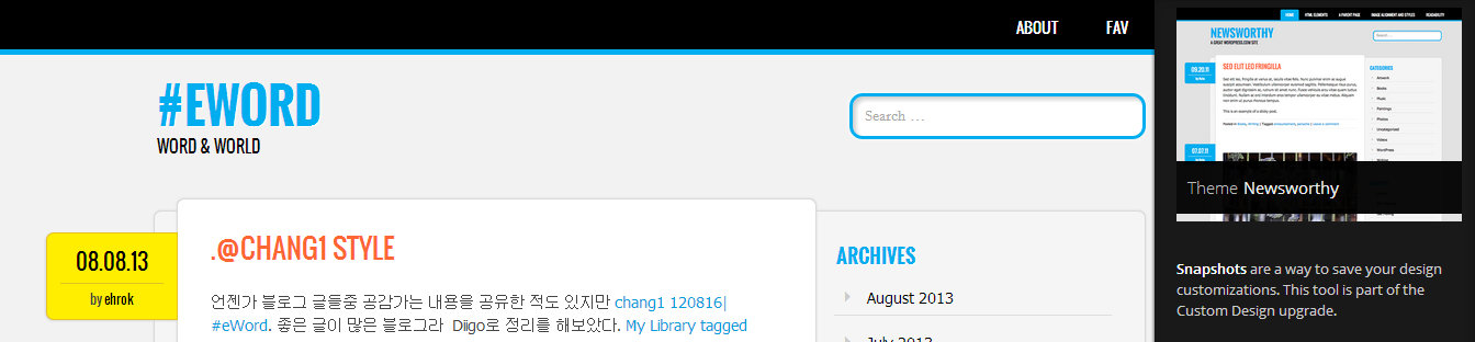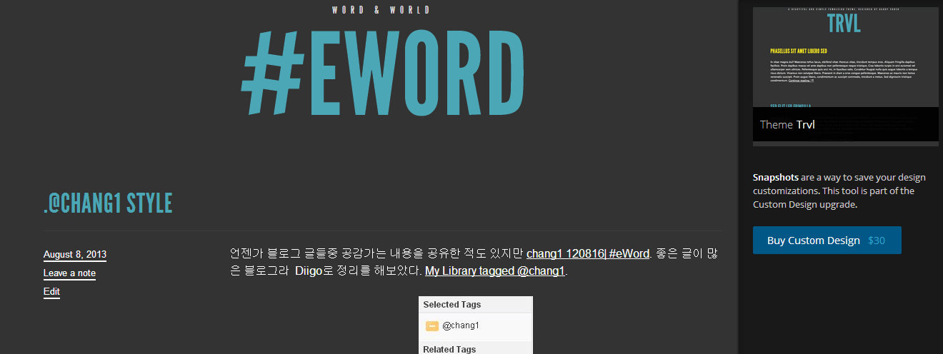 1년정도 블로그에 사용해오던 디자인 테마 Theme:Journalist V19 120625 | #eWord. 를 바꿨다. 변화를 주고 싶기도 했었고, 밝은 바탕보다 어두운 바탕이 눈의 피로도를 줄일 수 있겠다는 생각이 있었다. 워드프레스 가입형의 경우 Dashboard > Appearance > Themes 메뉴로 가면 다양한 테마를 고를 수 있다.(한글 폰트에서 한계가 있긴 하지만 1년전 선택할 때 보다 훨씬 다양한 테마가 생겨 고르는 재미를 느낄 수 있을 정도다)