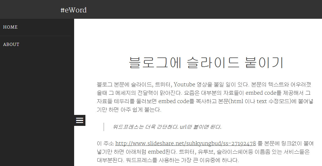 활자가 커지는 테마를 선택시 유의할 점은 url 주소등 한개의 단어가 길어지는 경우 모바일화면에서 여백을 잡아먹는다.