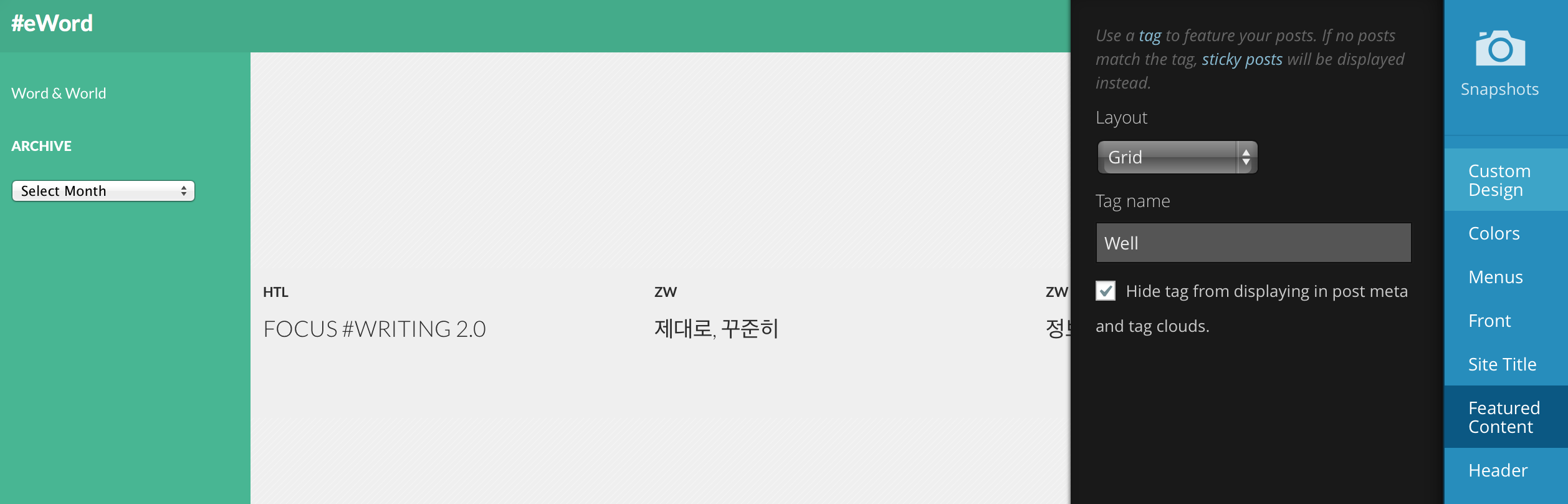 워드프레스 2014테마 주요특징: 모바일에서 목차를 깔끔하게 볼 수 있다. 한개의 태그를 지정해서 웹페이지 상단에 놓을 수 있다. (슬라이드, Grid 두가지 방식으로 가능)