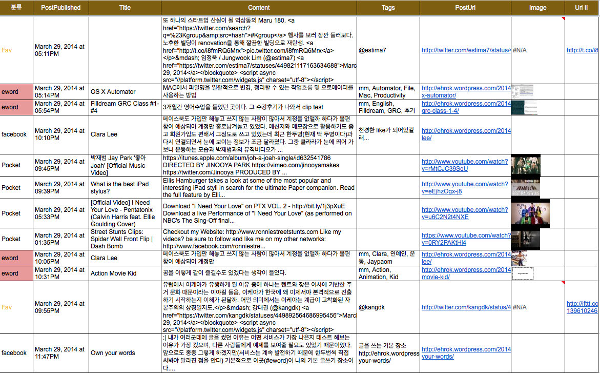 제일 상단에 있는 글과 제일 하단에 있는 글 두개를 제외하고는 어제 쓴 글이다. 글은 Scrivener를 주 도구로 놓고 Devonthink, Google Drive, ifttt, evernote, Tumblr, WordPress를 사용한다. 😎 뭐야 안쉬워보여 😐 어쨌든 이런 목록은 자동생성되며, 다시 돌아보기와 재분류하기를 쉽게 해준다.