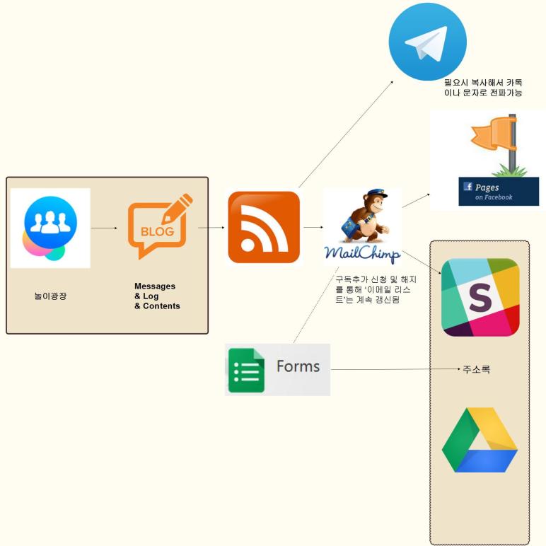 가장 추천하는 방법은 페이스북그룹을 놀이광장으로 하고 블로그(텀블러나 블로그스팟)를 사용하는 것이다. 이유는 비공개그룹의 경우 그룹참여자만 볼수 있다는 점, 링크로 연결이 쉽다는 점, 텀블러는 한번에 예전내용을 보기가 쉽다는 점, 블로그스팟은 각자의 구글계정으로 댓글이 연결되게 할 수 있다는 점들이다.