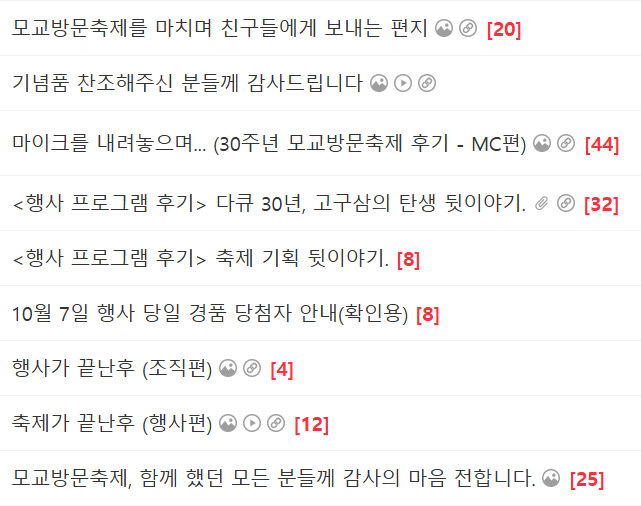 30주년 준비를 시작하시는 분들은 아래 글들 보시고, 여기 ’30주년 후배들을 위해’라는 게시판도 후배님들을 위해 만들었으니 마음껏 편하게 질문남겨주세요. 그럴때 제가 아는 범위를 넘어 다른 선배님들도 조언을 해주실거에요.