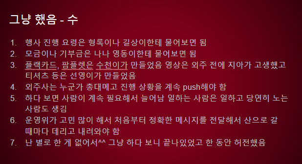 - 그 날 계속 강조했던 WHY? 가 제일 중요합니다. HOW는 모인 사람들이 편한 방식으로 진행하면 됩니다.