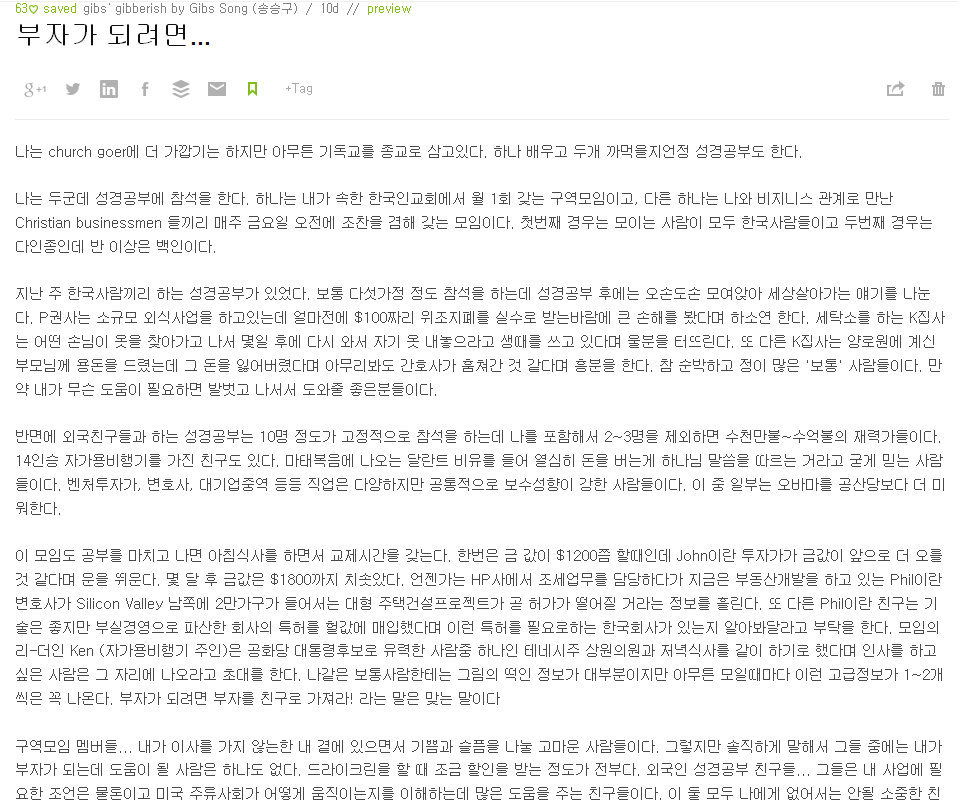 내가 참석하는 성경공부 모임은 두가지가 있다. 하나는 정이 많은 보통사람들, 다른 하나는 상당한 재력가들. “부자가 되려면 부자를 친구로 가져라”라는 말은 맞는 말이다. 하지만 둘다 소중한 모임이다. – gibs’ gibberish:부자가 되려면….